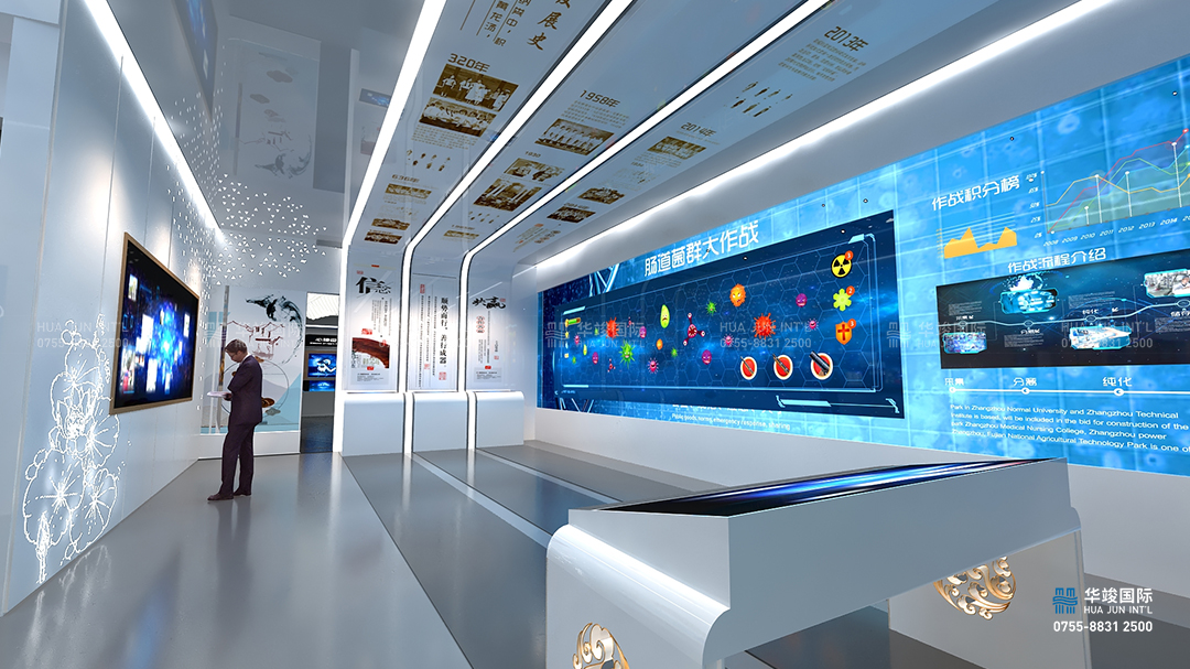 來到腸道菌群區(qū)域,頂部世界腸道菌群發(fā)展史一路向前,地圖可以實(shí)時(shí)更新世界是每個(gè)地域最新的醫(yī)學(xué)研究成果與醫(yī)療模式,參觀者可以通過互動(dòng)平臺,詳細(xì)了解鴻慈的臨床案例,主動(dòng)的與數(shù)字地圖產(chǎn)生交互,了解自己感興趣的最新醫(yī)學(xué)信息。